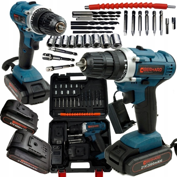 Wkrętarka akumulatorowa BERHARD ® 21 V wiertarko wkrętarka zestaw z dwoma bateriami oraz mega zestawem: